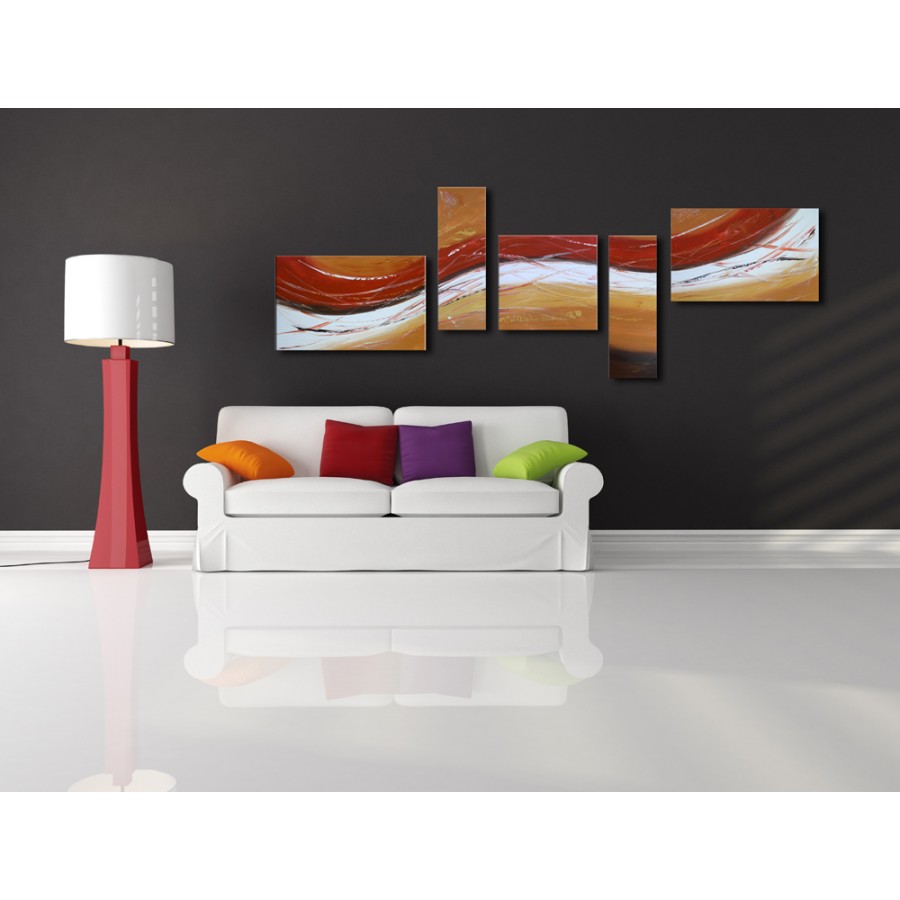 Quadro astratto composto da 5 tele separate ma caratterizzate dalla continuità del disegno. Una soluzione che riesce a soddisfare le esigenze di arredamento anche di grandi pareti.