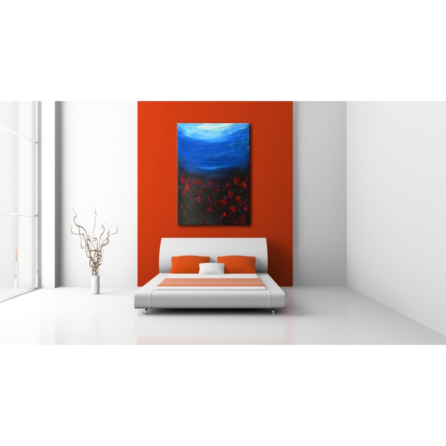 Dipinto astratto in tutte le sfumature del blu e dell'azzurro illuminate dalla luce del bianco.